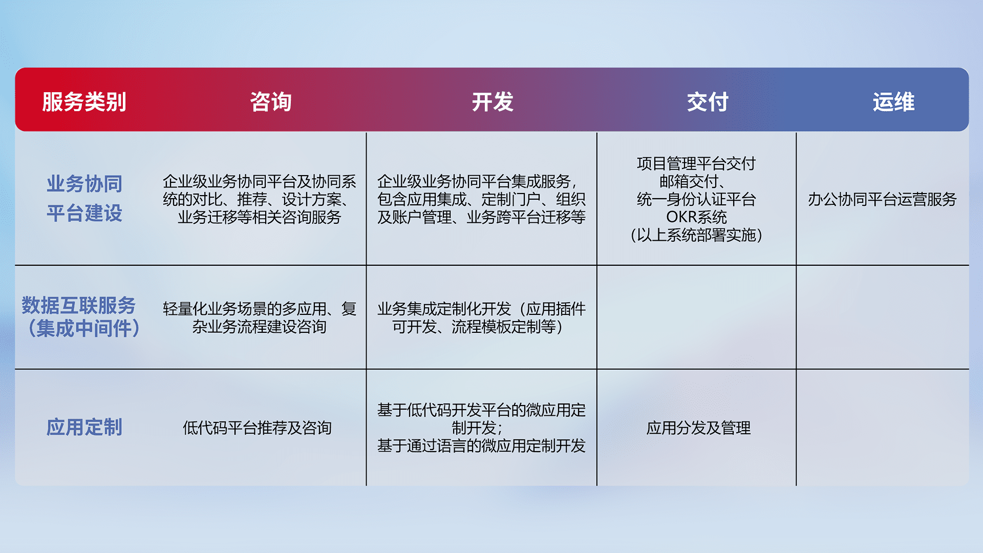 针对钉钉、、、、企微、、、、IDaas等平台级产品提供产品的规划、、、、方案、、、、交付、、、定制化开发等服务,,实现如统一协同办公、、、智能客户服务、、、混合会议管理、、、智能数据查询、、、、等业务场景,,实现数字化转型。。。